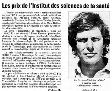 "Le Prix Médecine et Culture a été attribué à Jean-Christian Michel, chirurgien et grand compositeur, qui a participé en tant que médecin à la Vème expédition française en Himalaya et prépare une expédition au Tibet. Son prochain album fait appel aux plus récentes techniques de l'électronique musicale".